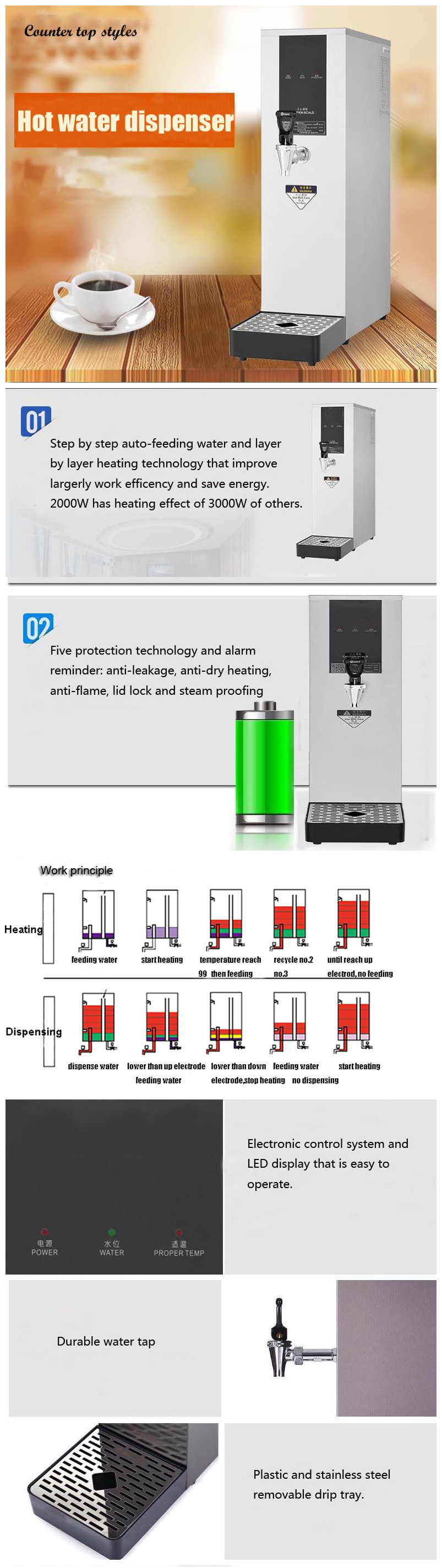 ►96°C high water temperature design to ensure the quality of beverages . The beauty of the bar is based on the patented technology of stepping water. It adopts imported chip electronic temperature control to ensure high water temperature supply of 93-96 °C, and provides customers with healthy and suitable boiling water.