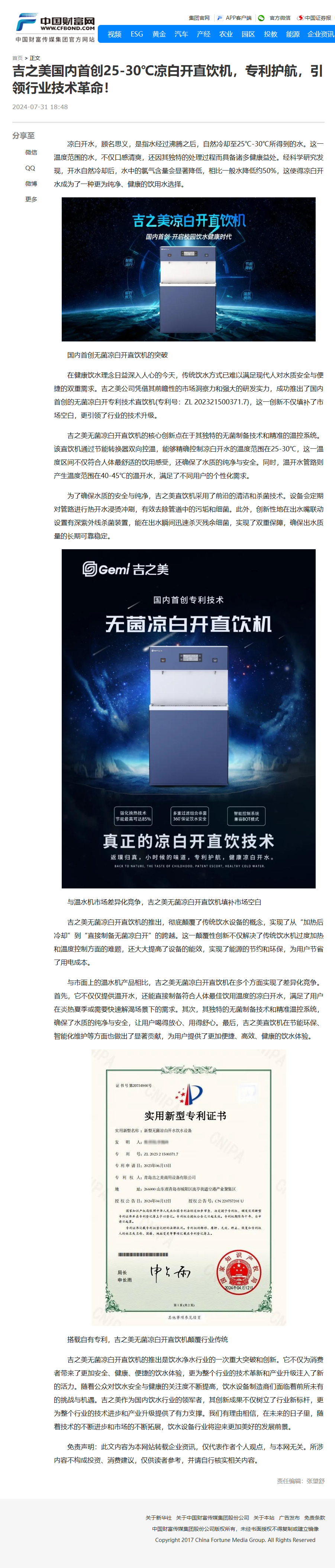 新闻报道 | 吉之美国内首创25-30℃凉白开直饮机,专利护航,引领行业技术革命!